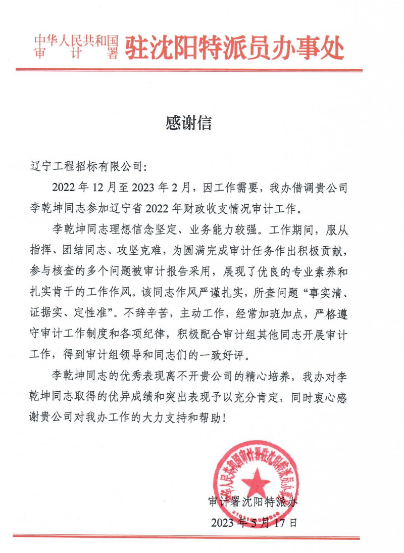 近日,JN江南·(中国区)体育官方网站再次收到审计署沈阳特派办的感谢信,对JN江南·(中国区)体育官方网站在工作中给予的帮助和支持表示感谢。