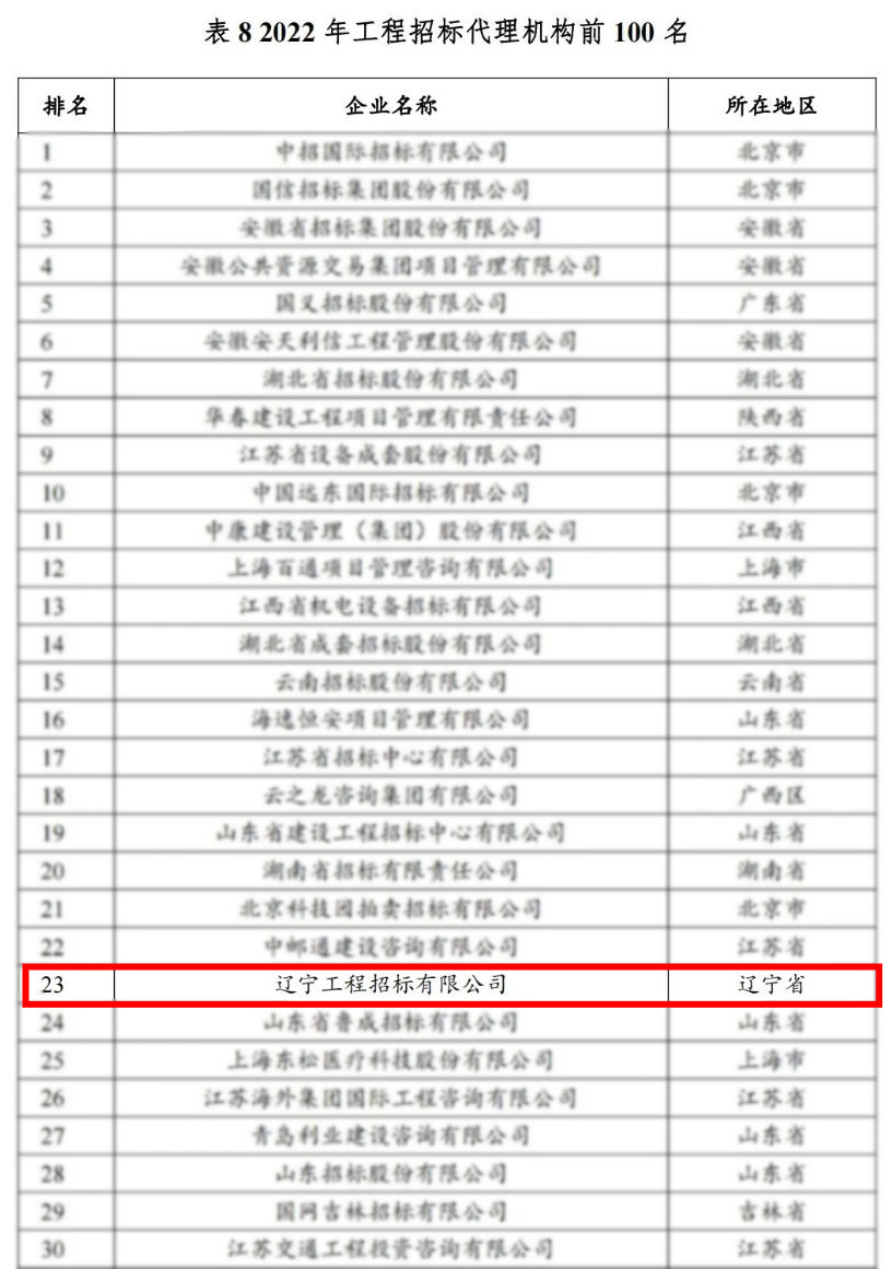 2023年8月,中国土木工程学会建筑市场与招标投标研究分会组织编写了《2022年度工程招标代理行业发展报告》,报告公布的2022年工程招标代理机构百强名单中,JN江南·(中国区)体育官方网站作为辽宁省唯一入选代理机构,荣获全国第23名。